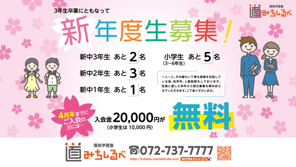 3年生の卒業にともないまして、新規入塾生の募集をさせていただきます! 少人数制の為、人数制限をしておりますので、定員に達し次第、締め切らせて頂きます。 よろしくお願いいたします。